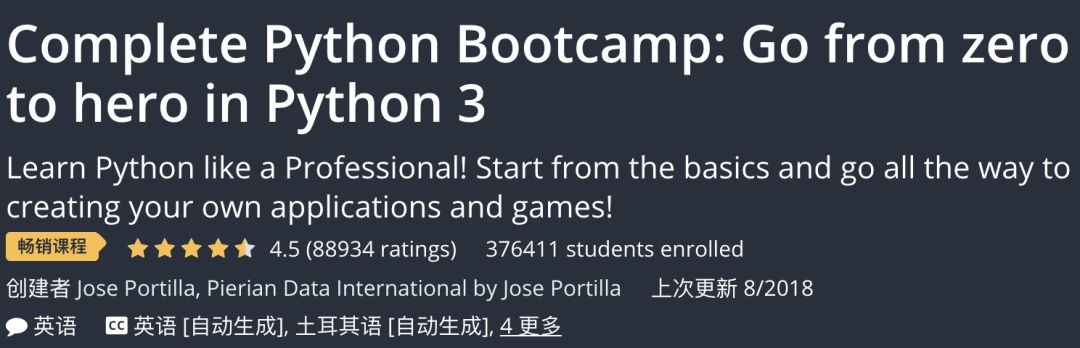 他的热情和经验在他的课程中表现得淋漓尽致,这就是为什么我们向你推荐这门Python课程,如果你是第一次学习Python。在内容上,这与其他两门课程没有太大的区别,但风格才是最重要的。
