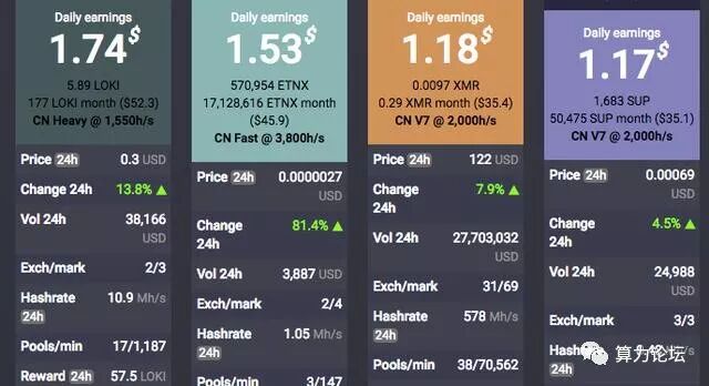 3.只挖日常收益高的。现在各类收益统计网站很多,算力论坛就有统计出20多个网站,每天每周都有收入最多的,这个属于赚辛苦钱,因为总要定期切换软件。同时受到各种租算力和矿场大算力影响,高收益存在时间一般不长。