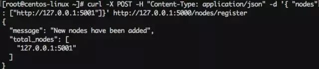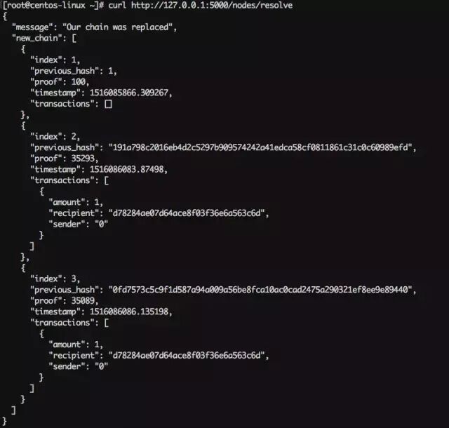 然后在第二个节点(5001端口)挖了一些块,确保该节点的链长度比第一个节点长。然后在第一个节点调用GET /nodes/resolve请求,可以看到节点1的链通过一致性算法被替换掉了。