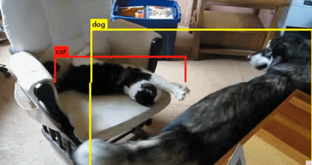 图为实时识别猫狗的动态位置,算法来自 Joseph Redmon ,他研究使用计算机视觉的一种检测系统yolo来定位他家的猫狗,相关介绍可自行搜索ted演讲How computers learn to recognize objects instantly。