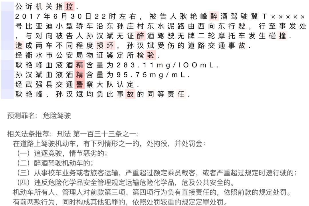 模型会输出预测的罪名以及相关法条的推荐结果,能够极大地提高律师的效率。并且模型还能将关键的句子以及词高亮出来给律师进一步仔细审阅提供方便。