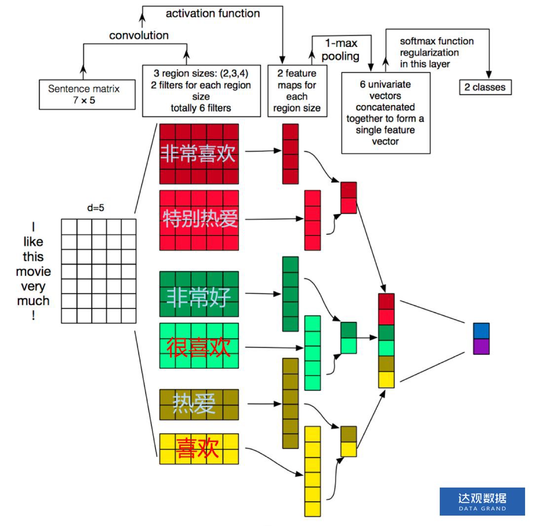 我们假设中文输出为字向量,理想情况下一个卷积核代表一个关键词,如下图所示: