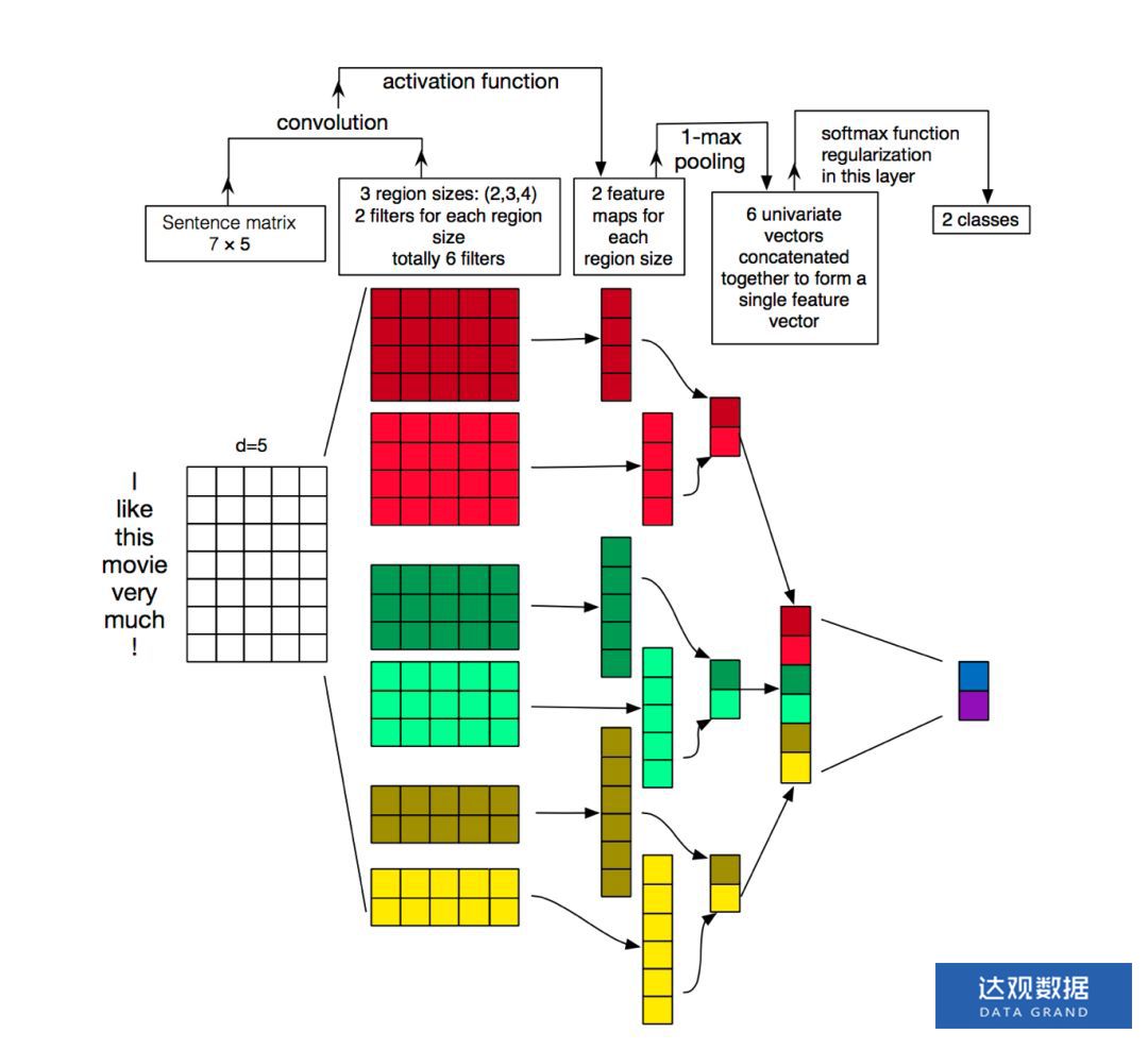 其中每个卷积核在整个句子长度上滑动,得到n个激活值,图中卷积核滑动的过程中没有使用padding,因此宽度为4的卷积核在长度为7的句子上滑动得到4个特征值。然后出场的就是卷积的好基友全局池化了,每一个卷积核输出的特征值列向量通过在整个句子长度上取最大值得到了6个特征值组成的feature map来供后级分类器作为分类的依据。