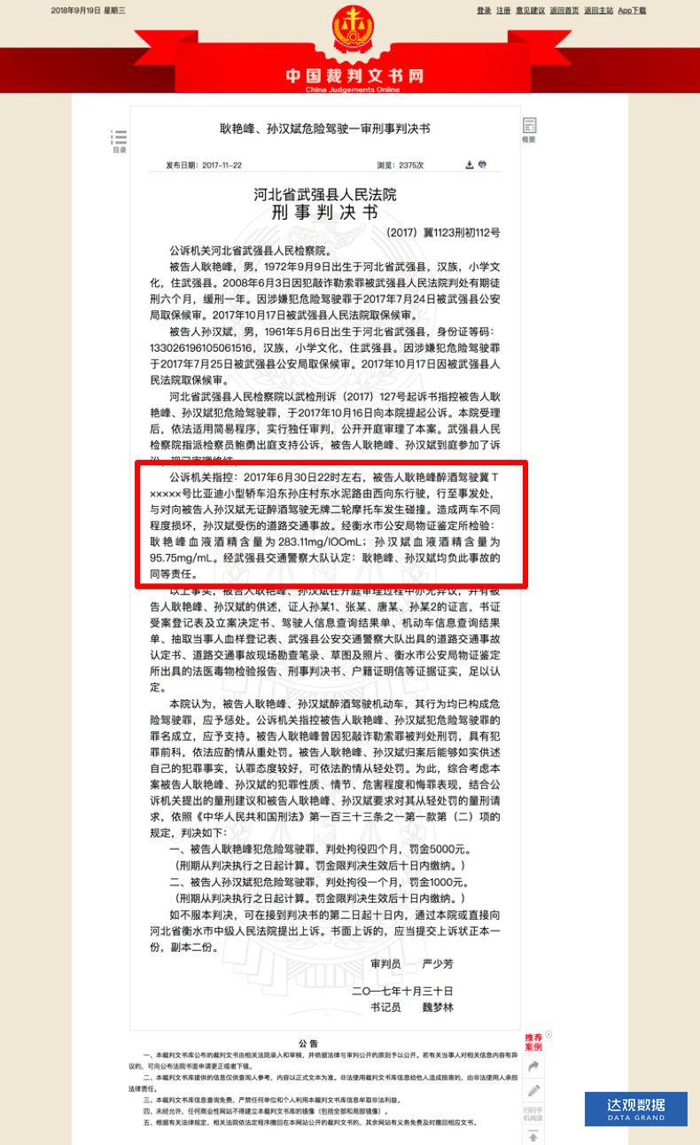 “公诉机关指控:2017年6月30日22时左右,被告人耿艳峰醉酒驾驶冀T×××××号比亚迪小型轿车沿东孙庄村东水泥路由西向东行驶,行至事发处,与对向被告人孙汉斌无证醉酒驾驶无牌二轮摩托车发生碰撞。造成两车不同程度损坏,孙汉斌受伤的道路交通事故。经衡水市公安局物证鉴定所检验:耿艳峰血液酒精含量为283.11mg/lOOmL;孙汉斌血液酒精含量为95.75mg/mL。经武强县交通警察大队认定:耿艳峰、孙汉斌均负此事故的同等责任。”