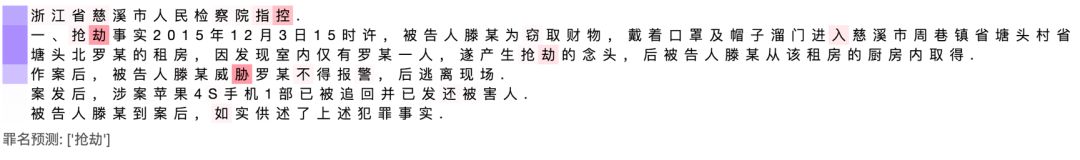 如下图所示,模型虽然在文本第二行中看到了窃取的字样,但是他认为这个案件中主要的事件是抢劫,这就是保留文本结构的好处。