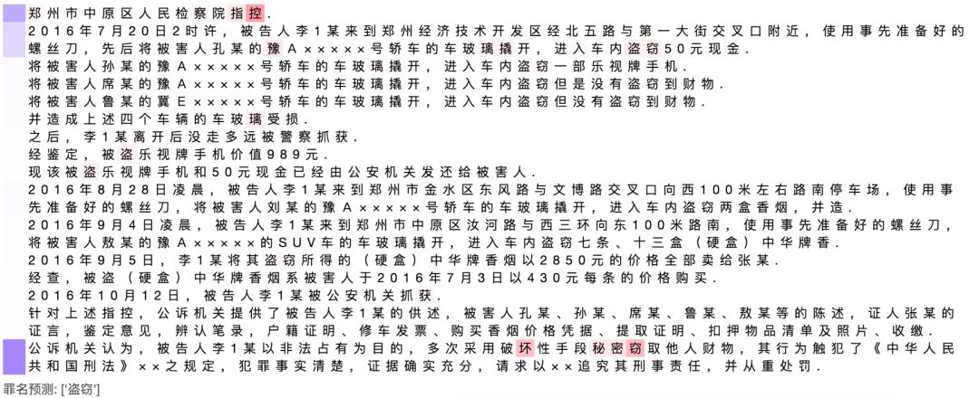 下面以裁判文书网的一篇裁判文书为例,我们截取其中的犯罪事实部分文字,输入模型。模型会根据输入的文字判断此段分类事实对应的罪名,并且高亮出犯罪事实中的关键内容。