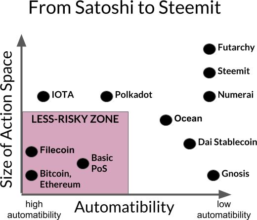 比特币说明,位于图表左下方部的区块链项目值得信任;但如今,范例已经大大扩展,乃至图表右上方的各个系统都分享了这种可靠性。最偏右上方的Steemit等系统也被人们作为一般性的基于区块链的加密经济系统对待了,而不认为它们与比特币有一丁点不同;但实际上,却一直没有评估措施确认它们的基本加密经济模型是否合格,能经受住时间考验。