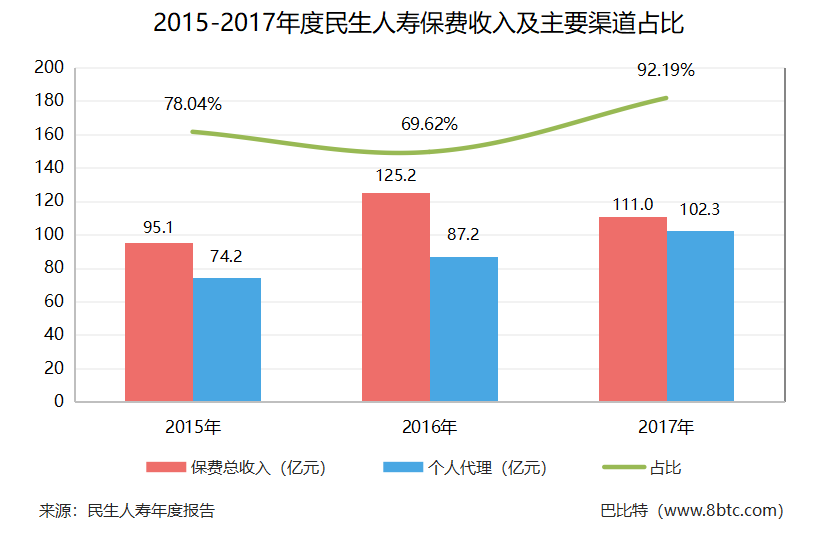 另外在民生人寿近3年的年报中,也并未提及互联网保险业务。2015年的时候还将网络销售的保费列入其中,只有29万元,相比当年所有渠道销售收入的95亿元来说,几乎可以忽略不计。个人代理依然是民生人寿保费收入最重要的渠道,甚至在2017年这一渠道贡献了民生人寿90%以上的保费收入,在互联网保险大热的这两三年,民生人寿似乎显得背道而驰,这也让我们对其互联网保险的探索产生怀疑。