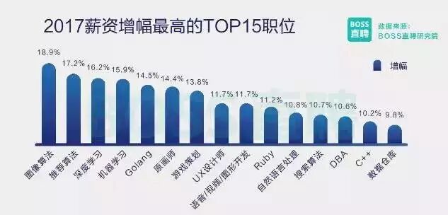 据BOSS直聘发布的《2017互联网人才趋势白皮书》显示:2017年互联网领域薪资增幅最高的Top15职位中,新兴技术岗位普遍排在前列。
