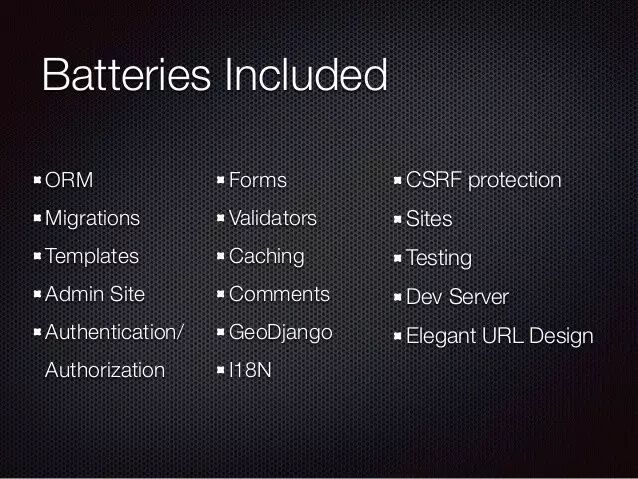 Django基于“Batteries-Included”的理念,可不必使用单独的库来实现常见功能,例如身份验证,URL路由,模板系统,对象关系映射器(ORM)和数据库模式迁移。如果您正在使用或使用Flask,您必须注意到它要求一个单独的库,如用Flask-Login来执行用户身份验证,而 Django不必这样做。