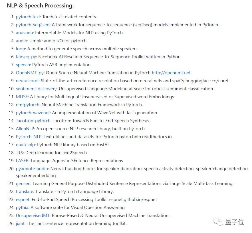 这一部分有二十六个资源,主要涉及语音处理、NLP、多说话人语音处理、语音合成、机器翻译等等。