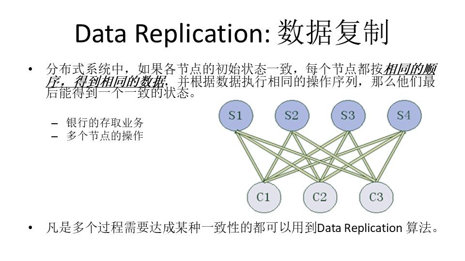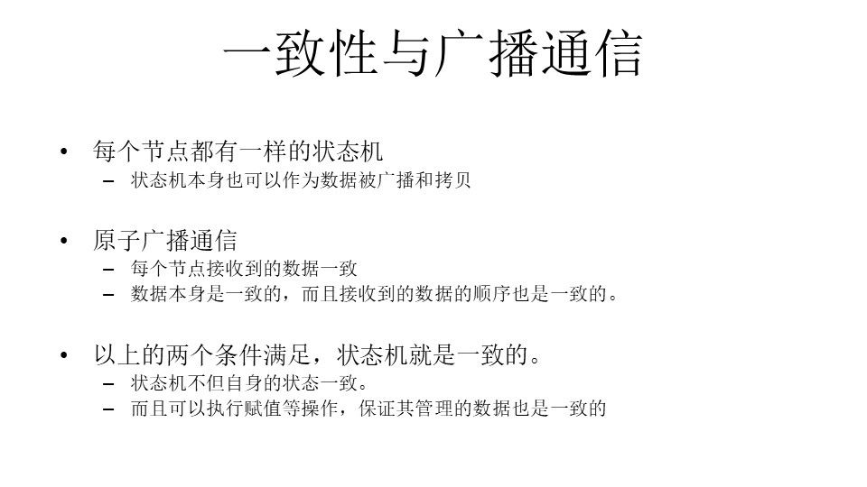 用计算机的术语来描述一致性。同样10台电脑,上面都有一个变量叫A,当所有变量A被赋值为1的时候,我们说是一致的。如果有9个机器赋值为1,另外一个机器赋值为0,这就是不一致。我们知道赋值不会自动发生,一般是有一个状态机给它赋值。如果多个节点的状态机里面,状态都是相同的,这就是一致的。在一个集群里面,所有状态机,输入状态机的数据是相同的,而且是同顺序的。这时候状态机就会停止在同一个状态,我们说状态机取得了一致。