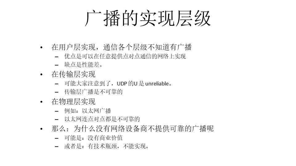 第一层是用户层实现,好处是很容易应用,缺点就是性能比较差。第二层在物理层实现,但是还没有一种网络设备提供可靠的广播。