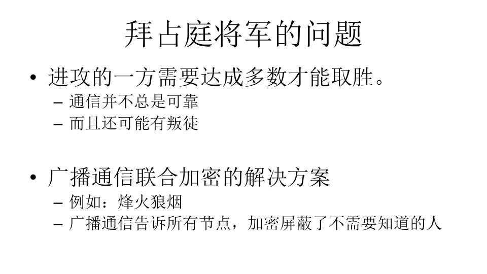 拜占庭将军,是不确定性的通信系统。这个问题怎么解决?广播出去让所有人都知道,广播解决方案可以叫做去中心化,也可以叫多中心化。