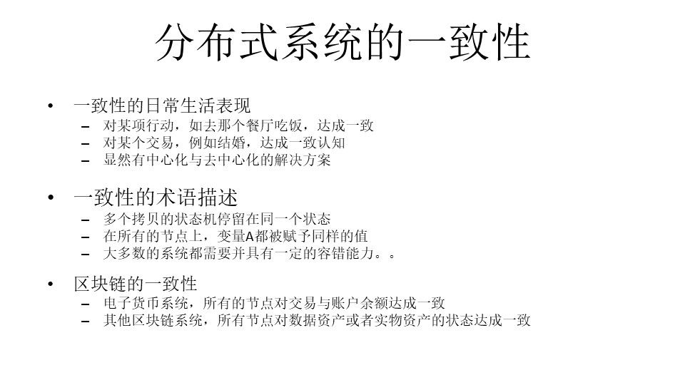 一致性在我们日常活动中例子,可以用我们几个人去哪吃饭的决策过程来举例。有几个方案来决定。一个是一人决定。第二种是一个人说的不算,需几个人投票。第一种方案是很典型的中心化权力方案,第二种方案我们用高大上投票方案,很多一致性基于多数投票(Quorum)的。比如说在比特币里是最长链说了算,DAG里面说权重最重的那部分说了算,其实都是投票制的方案。