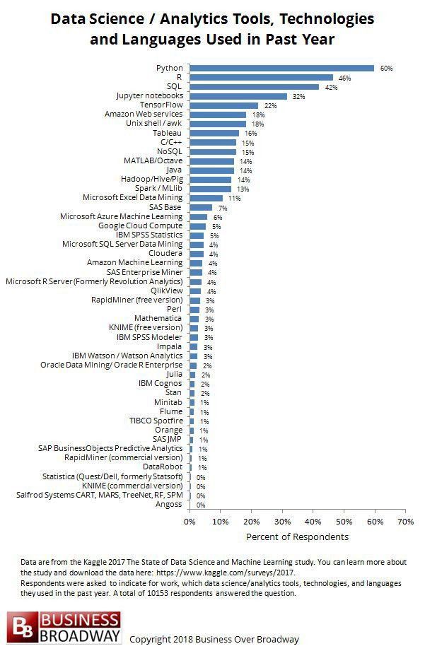 下表列举了数据科学家和机器学习工程师的常用工具,读者可以查看这些工具的流行度。