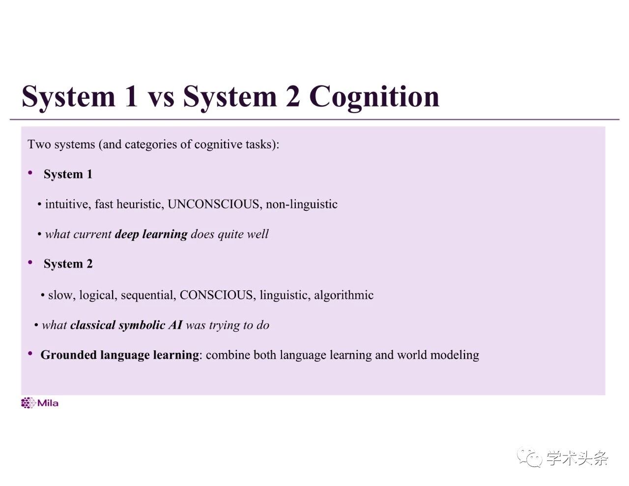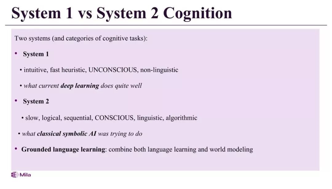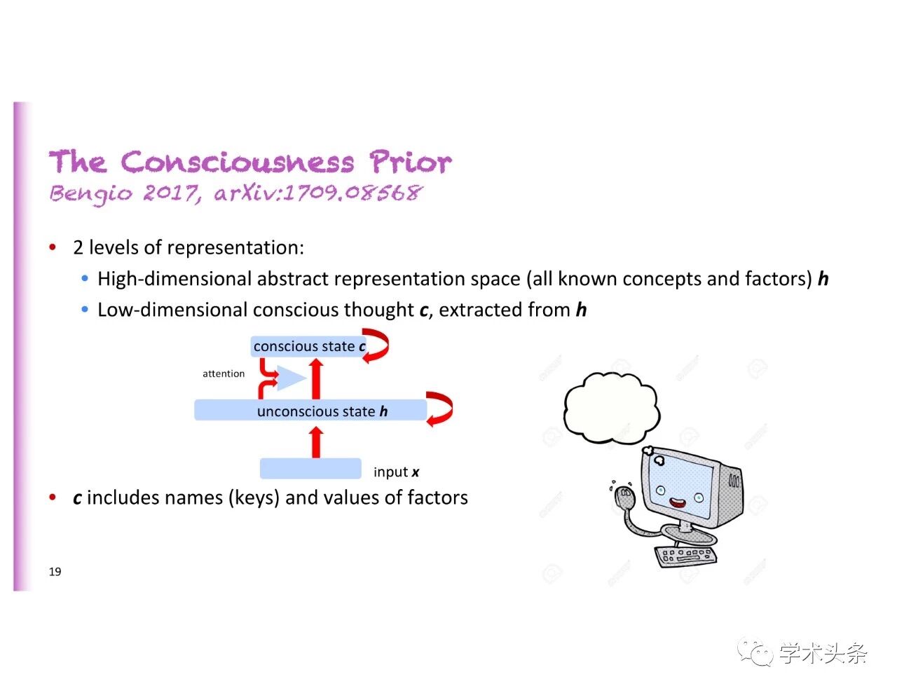 他于2017年发表的论文《The Consciousness Prior》,里面提到与完整的状态相比,有意识的思想是非常低维度的对象,无意识的大脑=类似于基于规则的系统中的句子或规则,但它们具有意想不到的预测价值或有用性。