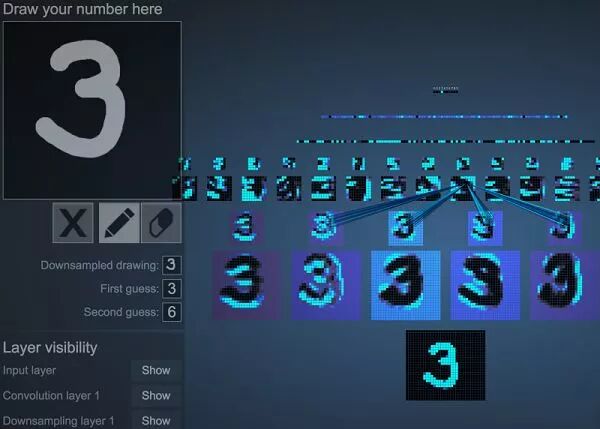 是不是很酷?该视频显示每个层变得更简单,而不是变得更复杂。就像函数将数据分解成较小的部分一样,以抽象的概念结束。你可以在该网站(Adam Harley)与此流程进行交互。