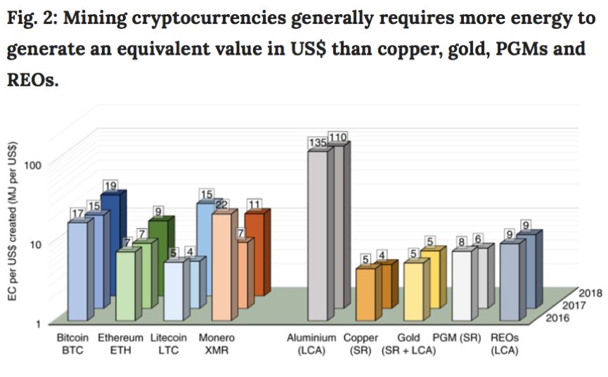 本文对数字货币网络的能源消耗情况进行了研究。本文选取了Bitcoin, Ethereum, Litecoin 和Monero几种加密货币,计算了在几种货币网络中,为产生价值1美元的数字资产所需要的最小能耗。研究发现,从2016年1月1日到2018年6月30日,为产生一美元价值,开采Bitcoin, Ethereum, Litecoin和Monero平均需要消耗17、7、7和14兆焦能量。相比之下,在传统的采矿行业中,为产生一美元价值,铝、铜、金、铂和稀土氧化物的开采分别消耗122、4、5、7和9兆焦耳。这表明,除了铝矿开采之外,加密货币的开采比传统矿物开采的单位能耗还要高。在研究的时间段内,作者估计这4种加密货币的开采带来了300万至1500万吨二氧化碳的排放。此外,作者指出,文中研究的四种加密货币中,三种货币的需求呈上升趋势,表明其能源需求将继续增加。