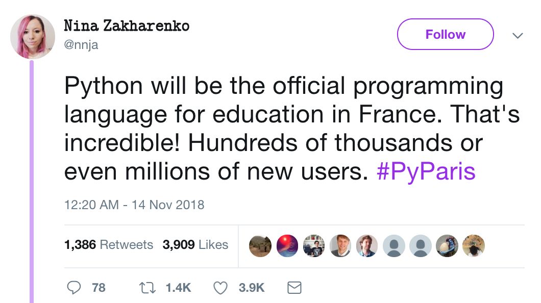 Python 或将成为法国高中的官方编程教学语言,这将带来几十万甚至几百万的新用户。此消息来自 Nina ,她是微软云开发的倡导者(Cloud Developer Advocate)、资深软件开发者、pythonista(Python 高手),同时也是一位知名讲师。