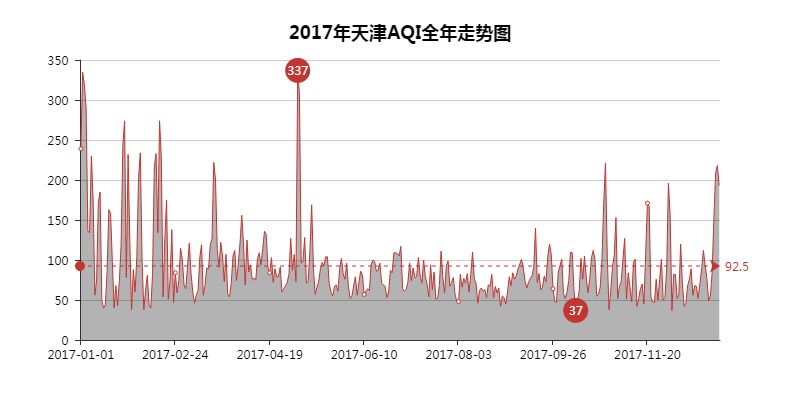 92.5是年均AQI值,从上面科普知识里可以知道,2017年天津整体空气质量只能是「良」中的下下等水平,与轻度污染近在咫尺。