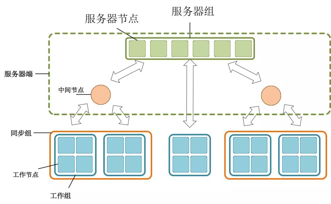 同步和异步算法有各自的优缺点和适用场景。如果可以把它们结合起来应用,取长补短,或许可以更好地达到收敛速度与收敛精度的平衡。例如:对于机器数目很多、本地工作节点负载不均衡的集群,我们可以考虑按照工作节点的运算速度和网络连接情况进行聚类分组,将性能相近的节点分为一组。由于组内的工作节点性能相近,可以采用同步并行的方式进行训练;而由于各组间运算速度差异大,更适合采用异步并行的方式进行训练。这种混合并行方法既不会让运行速度慢的本地工作节点过度拖累全局训练速度,也不会引入过大的异步延迟从而影响收敛精度。图9.10展示了一个能够完成这种混合并行的原型系统框架。