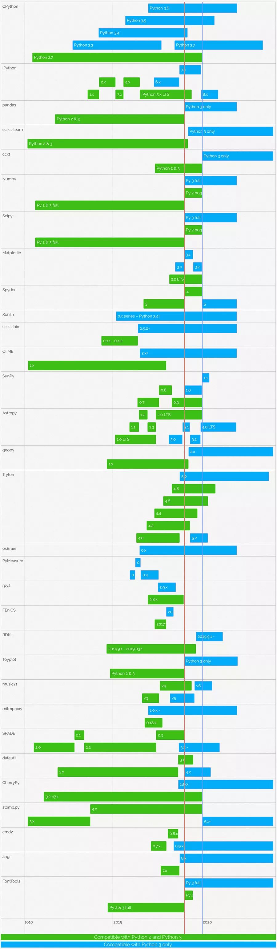 事实上,几乎目前所有主要的开源 Python 包现在都同时支持 Python 3.x 和 Python 2.7 ,并且多数已支持这两种语言版本多年。虽然市面上有能够有效保持兼容性的工具和技术,但在许多代码的开发过程中,仍然会有小的摩擦,开发者也不打算无限期地保持这种兼容性。眼看着官方即将停止支持 Python 2 ,以及越来越多的人使用、教学和推荐 Python 3 ,这些 Python 包的作者自然也更倾向于放弃 Python 2 ,从而简化代码并更好地利用 Python 3.x 的许多新功能。