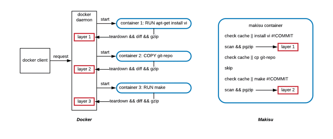 为了实现以上想法,我们开发了自己的image工具,Makisu[1],实现更加动态,更快容器创建,更加弹性等功能。其特点包括:与其它虚机相比Docker image更加轻量是因为中间层只包括运行开发步骤前后文件系统的差别。Docker计算差别,并使用需要特权的CoW文件系统生成中间层。为了实现不需要特权生成中间层,Makisu在内存中进行文件系统扫描。运行开发步骤后,在此扫描文件系统,更新内存视图,将变化文件添加到新一层。
