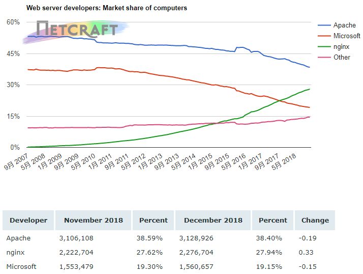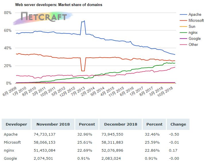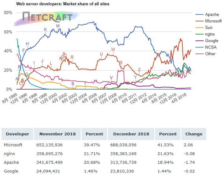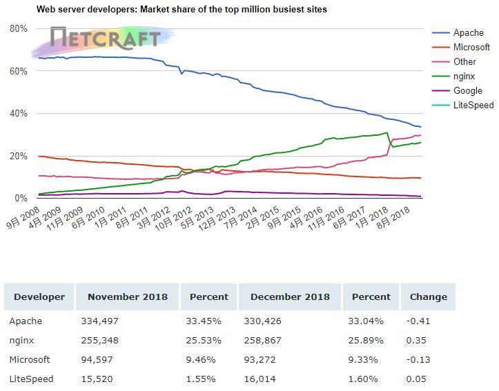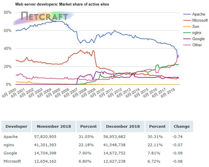NetCraft 公布了最新的2018年12月 Web 服务器调查报告。毫无意外,就全部网站的市场占有率来看,排名前三的依然是 Microsoft、ngnix 和 Apache。