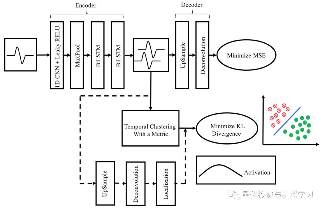 除了用RNNs/CNNs/自回归模型外,我们还对把时间序列聚集成有意义的群组有兴趣。我们可以用专门的时间序列距离(之前提过的DTW)以及矩阵为基础的聚集算法来处理这类问题,但是这样处理起来非常慢而且不是最优的方法。我们希望有一种能处理不同长度的信号,并且非常高效的方法。当然,我们可以要求神经网络为我们提供一个嵌入空间(例如自编码器),在那里我们可以进行聚集。我们可以在这些空间进行信号聚集或者增加自编码器完成附加任务,如这项研究所完成的一样。