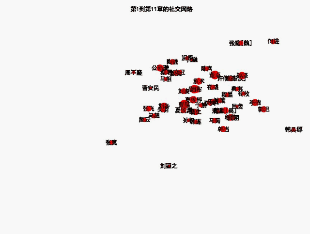 这里,我取10章的文本作为跨度,每5章记录一次当前跨度中的社交网络,就相当于留下一张快照,把这些快照连接起来,我们就能够看到一个社交网络变化的动画。快照还是用networkx得到,而制作动画,我们可以用moviepy。