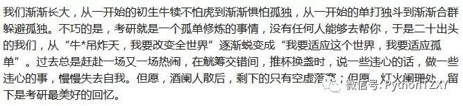 “考研是孤独的,孤独两个字拆开,有孩童,有瓜果,有小犬,有蚊蝇,足以撑起一个那年盛夏傍晚的巷子口,人情味十足。稚儿擎瓜柳蓬下,细犬逐蝶深巷中。人间繁华多笑语,唯我空余两鬓清风。孩童、水果、猫、狗、飞蝇当然热闹,可都与你无关,这就叫孤独,这就叫考研。”