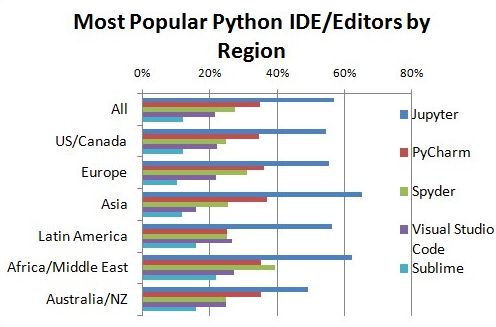 Jupyter在任何地方都一马当先。美国/加拿大、欧洲、亚洲和澳大利亚/新西兰等地区也有着相同的偏好顺序:Jupyter > PyCharm > Spyder > VS Code > Sublime。