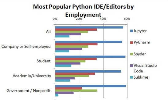 唯一的主要区别是,政府/非营利机构的人的第二选择是Spyder,而不是其他人的PyCharm。