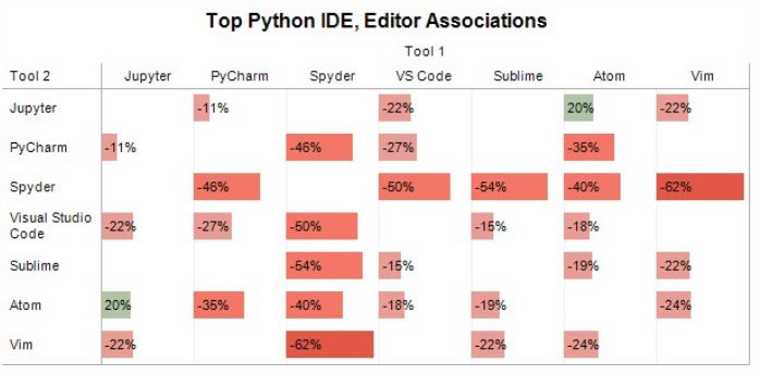 除了Jupyter和Atom以外,我们看不到任何明显的正相关。同时Spyder、PyCharm和Visual Studio code作为对Jupyter的补充,很明显是相互“排斥”的。