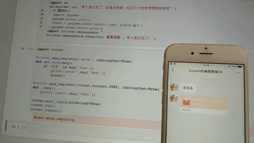 msg_register是注册消息时间的响应函数,'Note'是红包、转账等通知消息类型,isGroupChat=True包含了群聊。当网页版收到红包后,会显示“收到红包,请在手机上查看”。所以判断消息文本中包含“红包”字样时,就发出提醒。