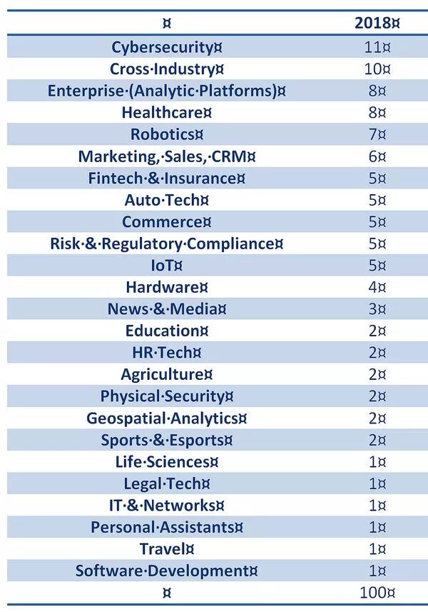 预测 2:随着人工智能 / 机器学习从分析平台转移到特定于行业或流程的应用程序,一切都将变得更容易。纵观人工智能 / 机器学习初创企业的世界,就能看出竞争正在转向特定于行业或流程的应用程序。这些应用程序或迷你平台专注于解决行业中特定的业务问题,如市场营销、B2B 销售、医疗保健、金融科技以及其他大约十几个已经明确定义的领域。要想有一个快速地了解,请参考下图(CB Insights 年度人工智能 100 家优胜者)以及他们按行业或流程进行分类的方式。