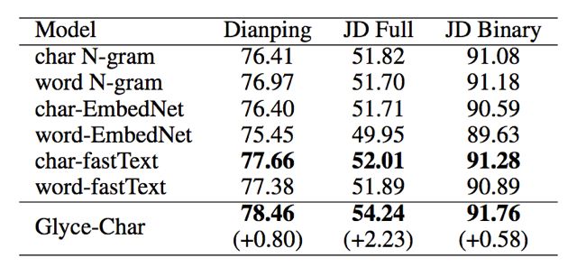 情感分析的任务采用了 Dianping,JD Full, JD Binary 三个数据集,并且采用准确率作为最终的评价指标。Glyce 字向量结合 Bi-LSTM 模型分别在这三个数据集上面取得了最优的结果。