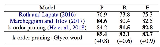 语义决策标注的实验采用了 CoNLL-2009 的数据,并且采用 F1 作为最终的评价指标。最优模型 k-order pruning 和 Glyce 词向量超过了之前最优模型 0.9 的 F1 值。