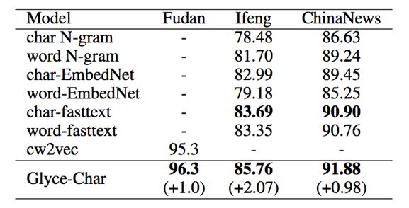 文本分类的任务采用了 Fudan corpus, IFeng, ChinaNews 三个数据集,并且采用准确率作为评价指标。Glyce 字向量结合 Bi-LSTM 模型在这三个数据集上分别取得了最优的结果。