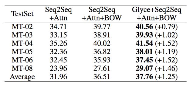 中文-英文机器翻译任务的训练集来自 LDC 语料,验证集来自 NIST2002 语料。测试集分别是 NIST2003,2004,2005,2006 和 2008,并且采用 BLEU 作为最终的评价指标。Glyce 词向量结合 Seq2Seq+Attention 模型,测试集上 BLEU 值达到了新的最优结果。