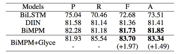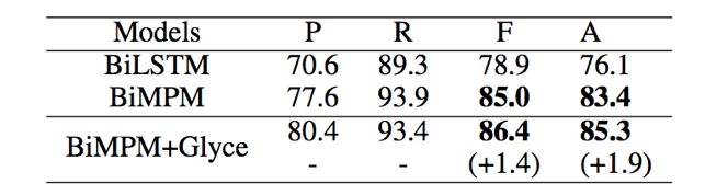 语义相似度的实验采用了 BQ Corpus 的数据集,并且采用准确率和 F1 作为最终的评价指标。Glyce 字向量结合 BiMPM 模型在之前最优结果的基础上提高了 0.97 个点,成为了新的 state-of-the-art。