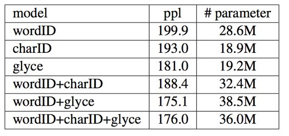 词级别的语言模型采用了 Chinese Tree-Bank 6.0 (CTB6.0)语料,并且采用 PPL(困惑度)作为最终的评价指标。经过对照实验,word-ID 向量和 glyce 词向量在词级别的语言模型上效果最好,PPL(困惑度)达到了 175.1。