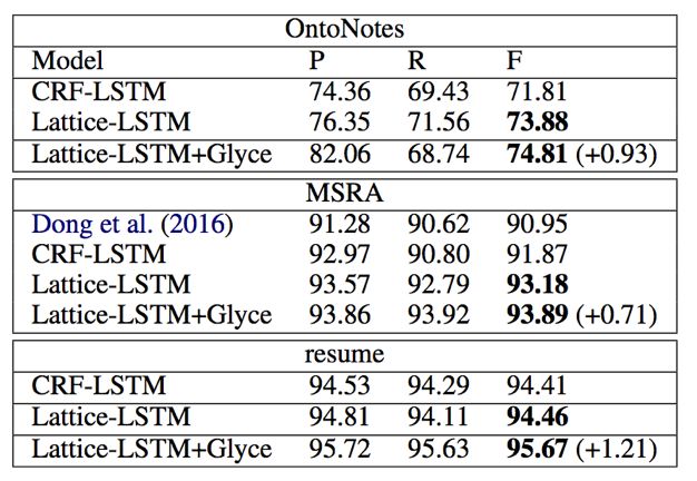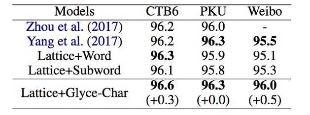 中文分词任务采用了 CTB6,PKU 和 Weibo 的数据集。Glyce 字向量结合之前最优的模型 Lattice-LSTM 在 CTB6 和 Weibo 数据上达到了新的最优的结果。在 PKU 的数据上达到了呵之前最优结果相同的结果。