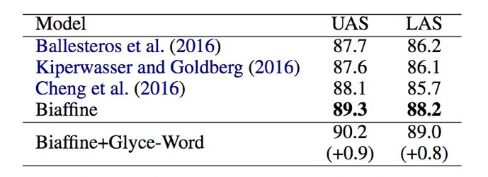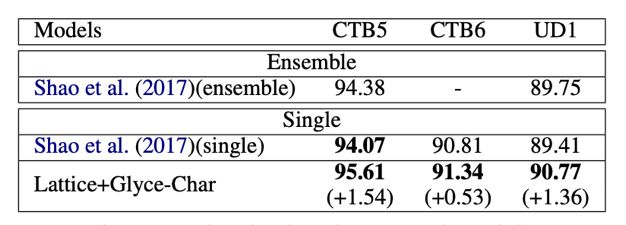 句法依存分析采用了 Chinese Penn Treebank 5.1 的数据。Glyce 词向量结合之前最优的 Biaffien 模型把结果在 UAS 和 LAS 数据集上和最优结果比较分别提高了 0.9 和 0.8。