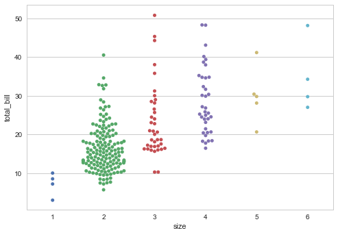 sns.swarmplot(x="size", y="total_bill", data=tips);