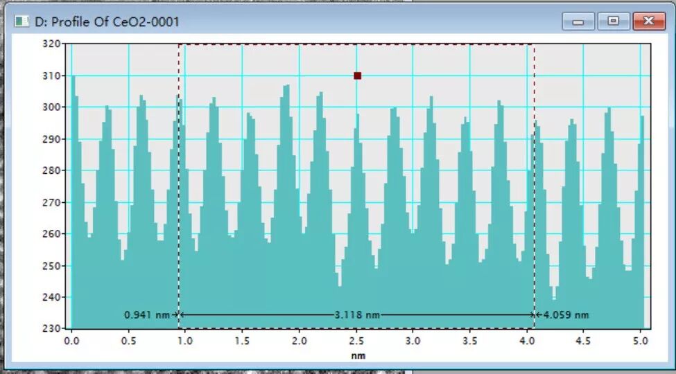 Step 5. 在Profile窗口中采用鼠标左键拽出一个虚线框(确保框线位于柱子正中间)即可显示出距离(图8),通常测量10个周期的距离求取平均值得到晶格条纹的晶面间距。图8中的晶格间距为3.118 ÷ 10 = 0.3118 nm,对应CeO2的(111)晶面。