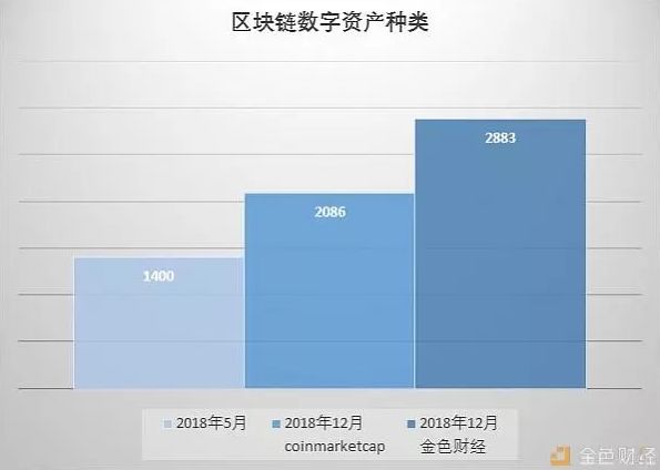 而截止2018年12月底,据coinmarketcap数据显示,当前该平台上可以追踪交易数据且仍然活跃的数字资产种类已达2086种。而行情数据显示,2018年底区块链数字资产种类已达2883种。