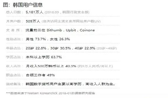 根据Nielsen Koreanclick的调研报告,韩国对于数字资产交易所的热衷程度还是非常强烈的,月活在500万左右,用户主要在20-49岁之间,且大部分为高学历及高收入人群。