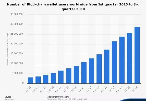 2018年全球使用区块链钱包的人数(钱包用户)迅速上涨。据相关数据显示,2018年Q3全球区块链钱包用户已达2888.8万人,与去年同期相比增长67.42%。